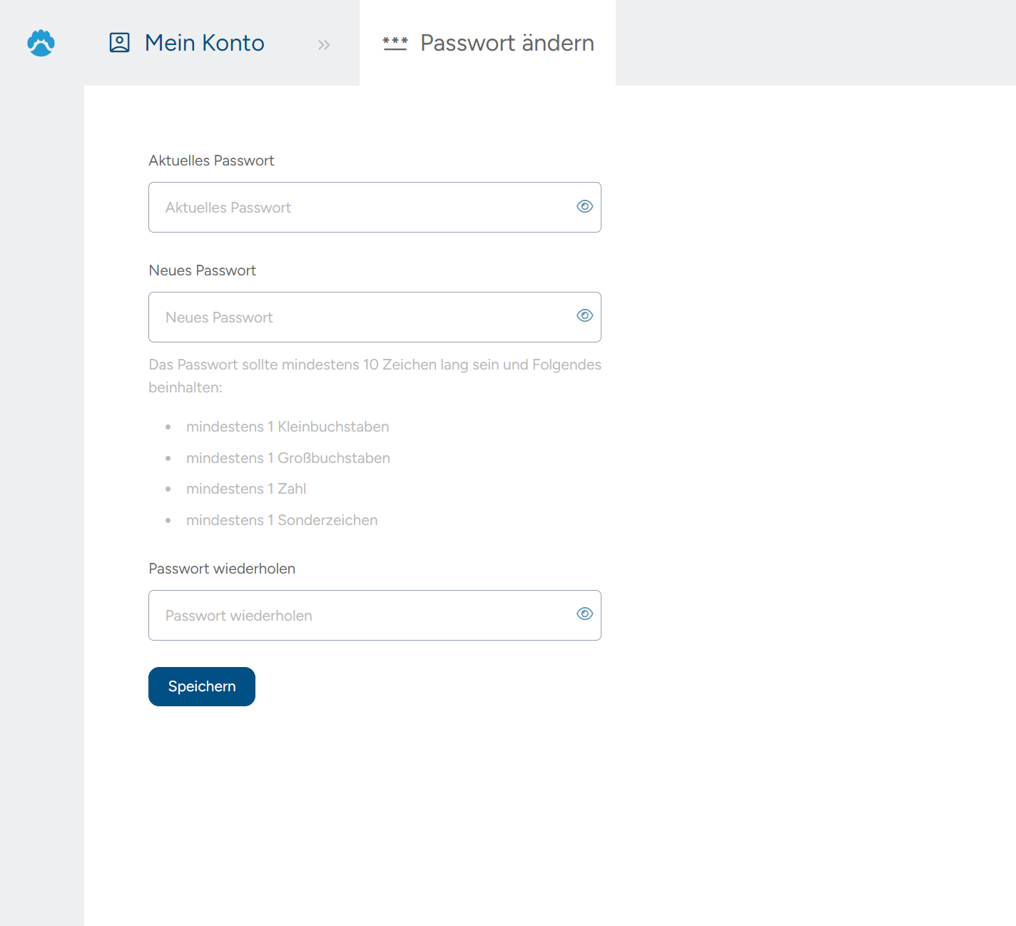 Gebe nun dein aktuelles Passwort sowie zwei mal dein gewünschtes neues Passwort ein. Bitte beachte dabei, dass das neue Passwort mit den aufgeführten Kriterien übereinstimmen muss.