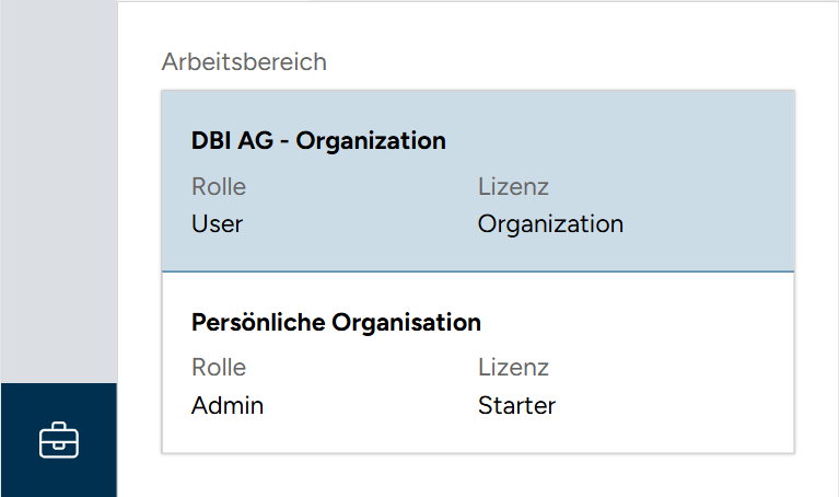 Du kannst in deinen Arbeitsbereichen wechseln. Dafür gehst du unten links auf den Arbeitsbereich (das Symbol: Aktenkoffer). Hier findest du immer deinen eigenen Arbeitsbereich (Persönliche Organisation) mit deiner gewählten Lizenz. Wenn du einer oder mehreren Organisationen zugeordnet bist, werden diese hier aufgeführt. Mit einem Klick kannst du zwischen diesen Bereiche wechseln.