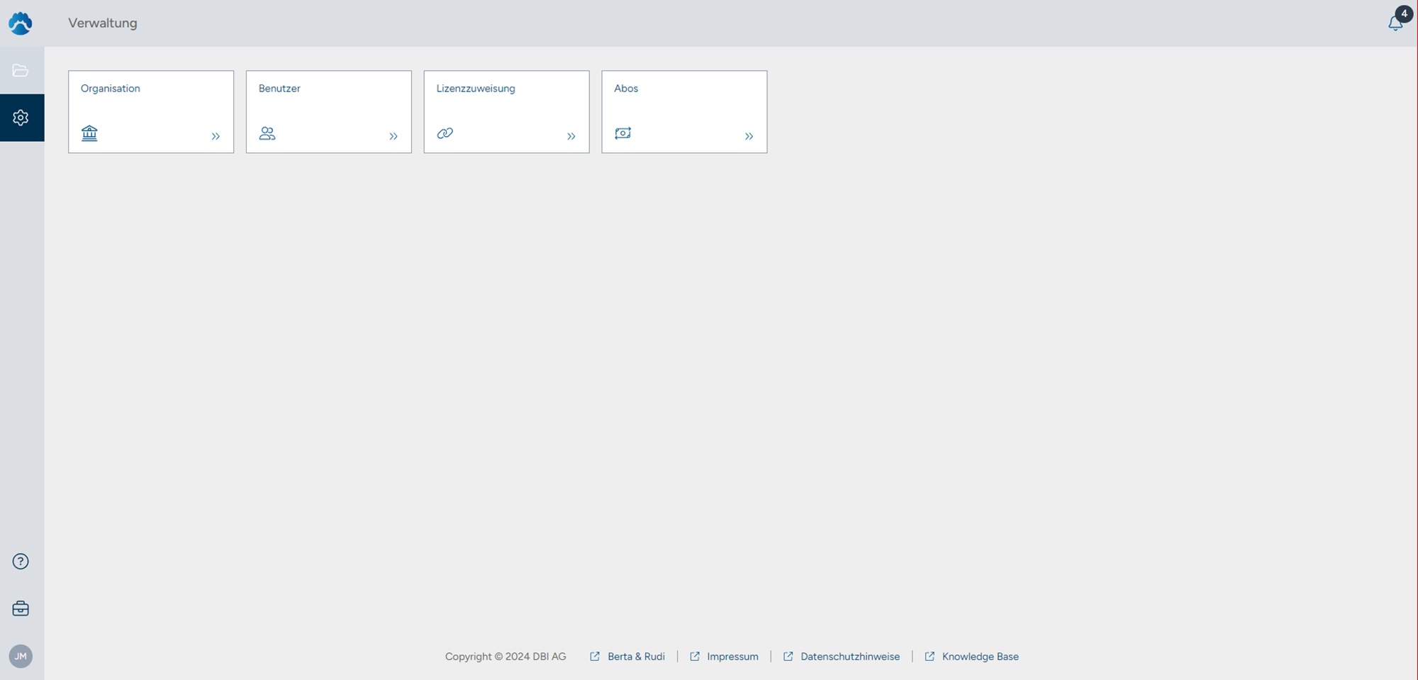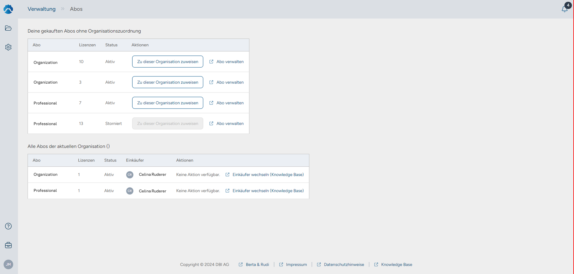 Die gebuchten Abos können über die Kachel "Abos" unter der Verwaltung aufgerufen werden. Die Verwaltung findest du Links bei dem Zahnrad-Symbol.