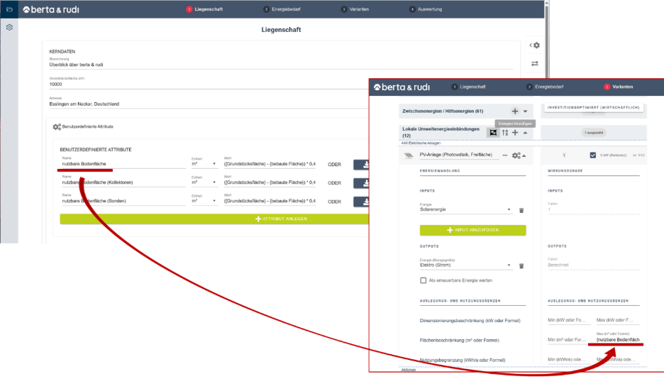 Die nutzbare Bodenfläche berechnet sich im Standard mit 40% der Grundstücksfläche nach Abzug der bebauten Fläche. Diese Fläche ist ein benutzerdefiniertes Attribut auf globaler Ebene und findet Anwendung in der Formel zur Flächenbeschränkung der Photovoltaik-Anlage (Freiflächen).