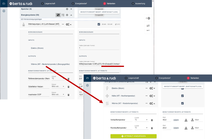 Während das Attribut „Output 1“ sich auf die Vorlauftemperatur der verbundenen Energie „Wärme (NT – Niedertemperatur)“ bezieht.