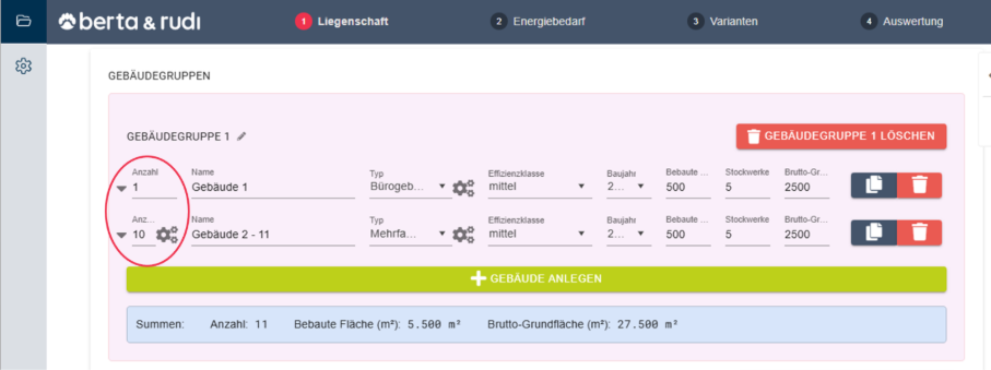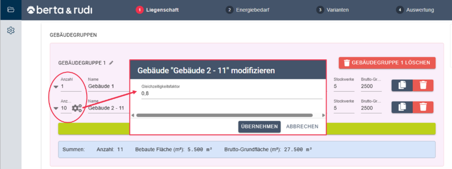 Der wichtigste Stellhebel zur Berücksichtigung von Gleichzeitigkeitsfaktoren in berta & rudi ist die Anzahl der Gebäude innerhalb einer Gebäudegruppe.