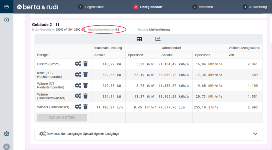 Im zweiten Schritt taucht der gewählte Gleichzeitigkeitsfaktor im Bereich „Energiebedarf“ des Gebäudeverbunds erneut auf.