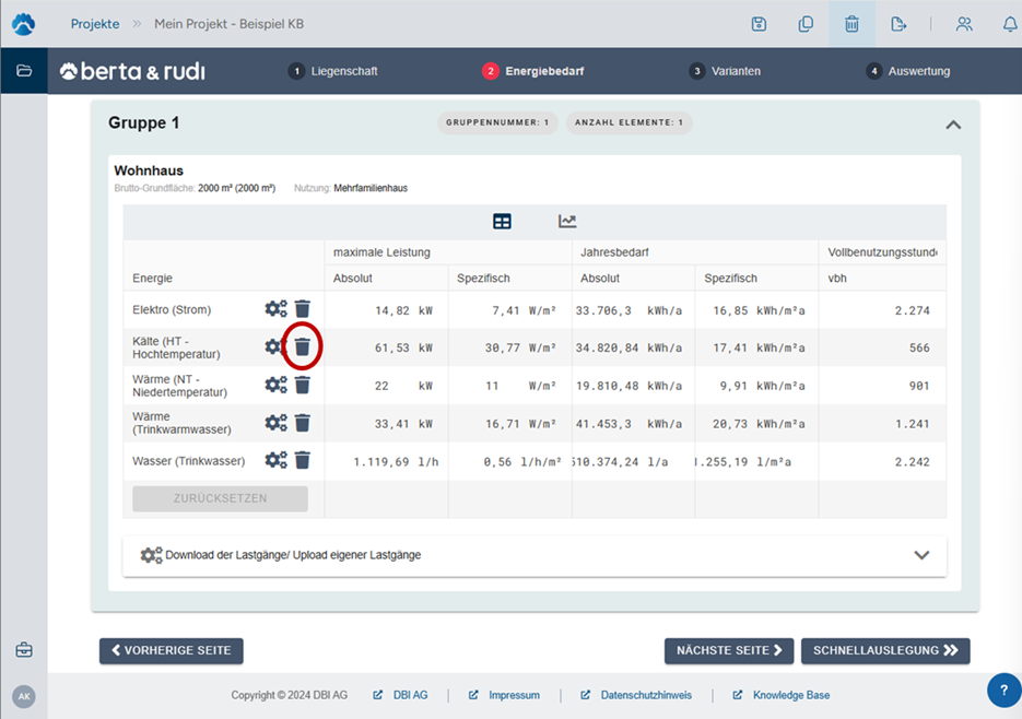 Wenn in deinem Projekt der Energiebedarf einer automatisch angelegten Energie nicht benötigt wird, kann dieser ganz einfach gelöscht werden. Über das Mülltonnen-Symbol an der nicht benötigten Energie lässt sich diese gezielt entfernen.