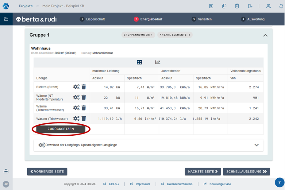 Sollte der Energiebedarf versehentlich entfernt worden sein, lässt sich der Vorgang problemlos rückgängig machen: Mit einem Klick auf „Zurücksetzen“ werden die ursprünglichen Energiebedarfe für das Gebäude bzw. für die Liegenschaft wiederhergestellt.