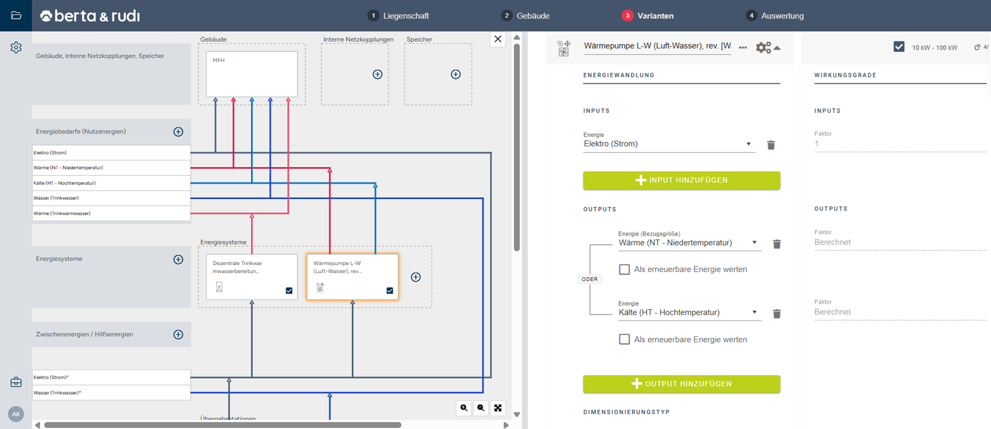 In der Split-Screen-Ansicht wird das Blockschaltbild parallel zur ausgewählten Variante angezeigt. Änderungen an Attributen wie z. B. Preisen oder Limits sowie die An- und Abwahl von Energiesystemen wirken sich ausschließlich auf die gewählte Variante aus.